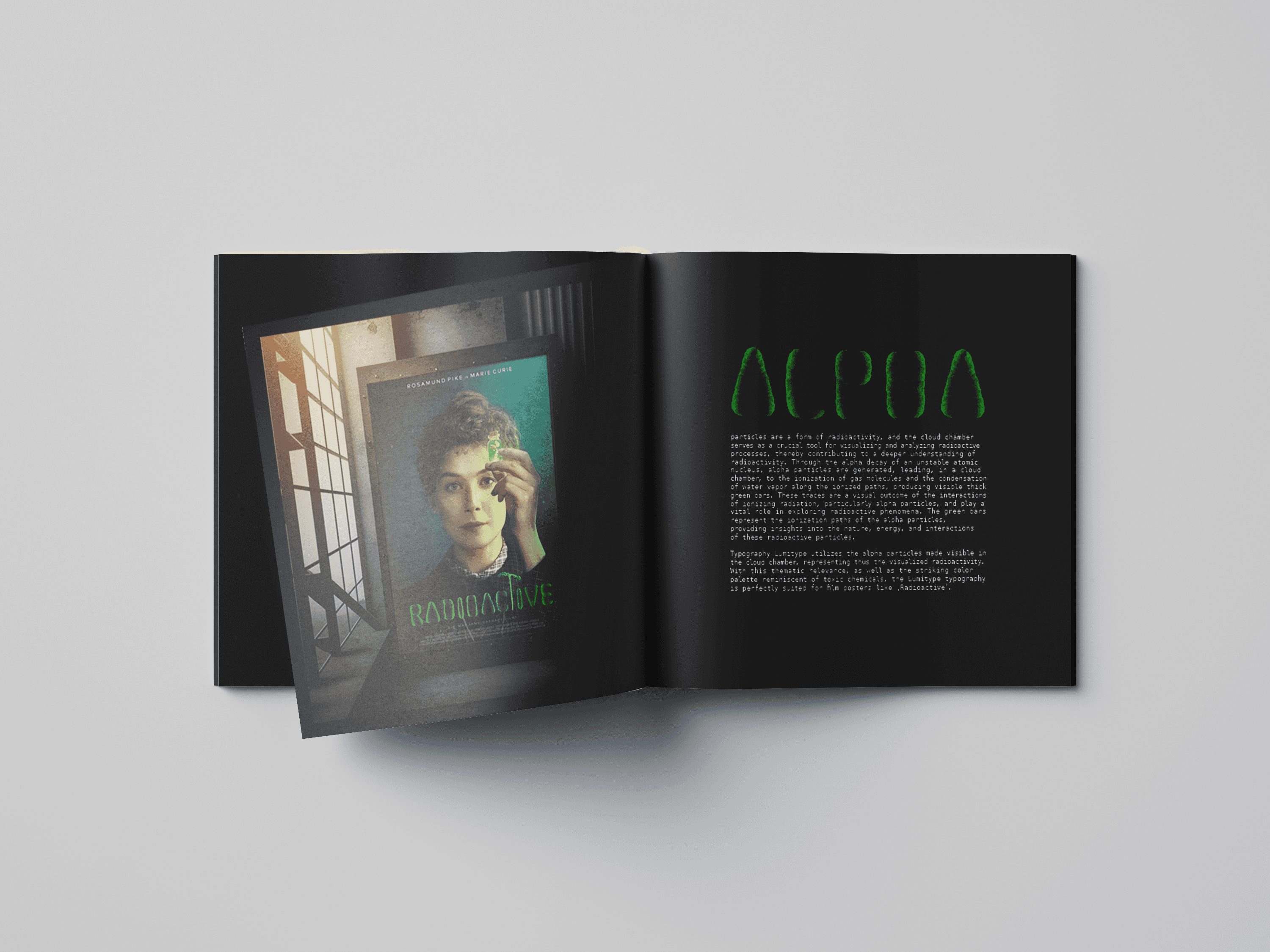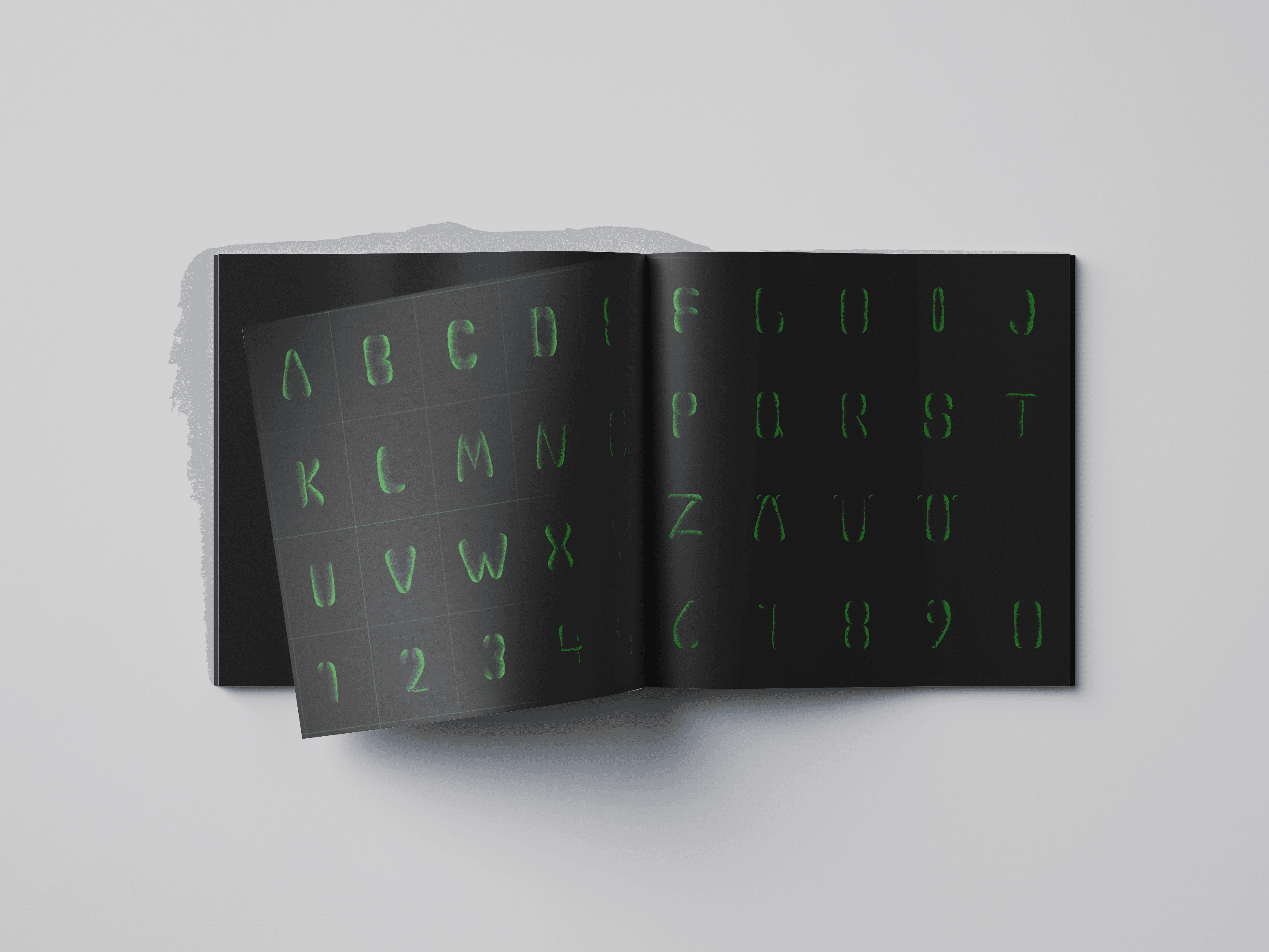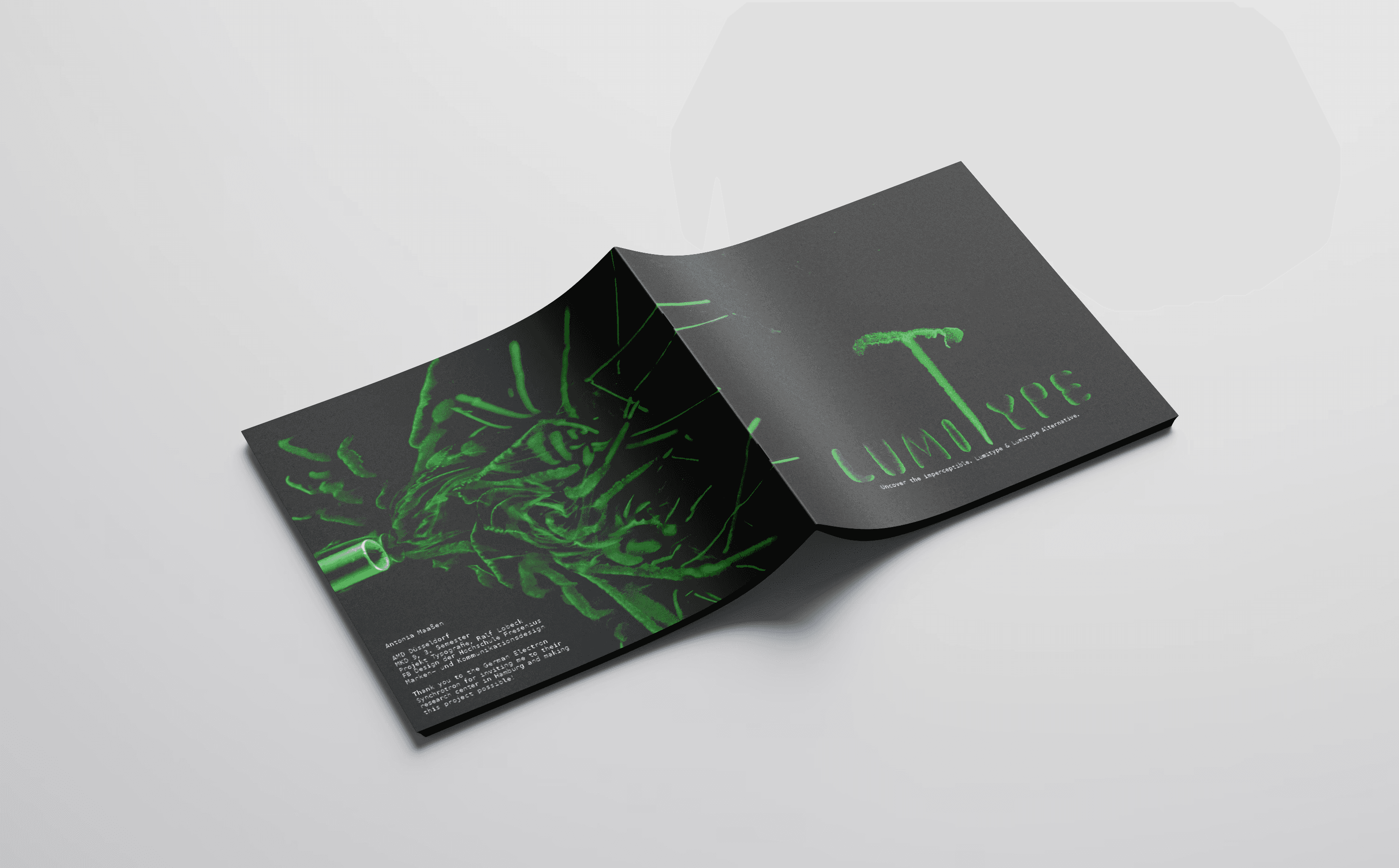 The result is Lumitype, a typeface generated from radiation, light, and movement, presented through a booklet that demonstrates its applications across different contexts, from science related communication to music related design. The alphabet is organized in a square grid inspired by the periodic table, linking the visual system back to its atomic origin. Overall, Lumitype translates an invisible natural process into a tangible, functional, and poetic design outcome that showcases how science and design can intersect.